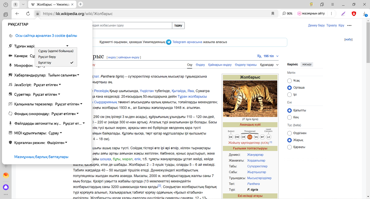• Рұқсат ету — сайттың (мысалы, Яндекс Карталарға) әр кірген сайын рұқсат сұрамай, орналасқан жеріңізді анықтауына мүмкіндік беру.