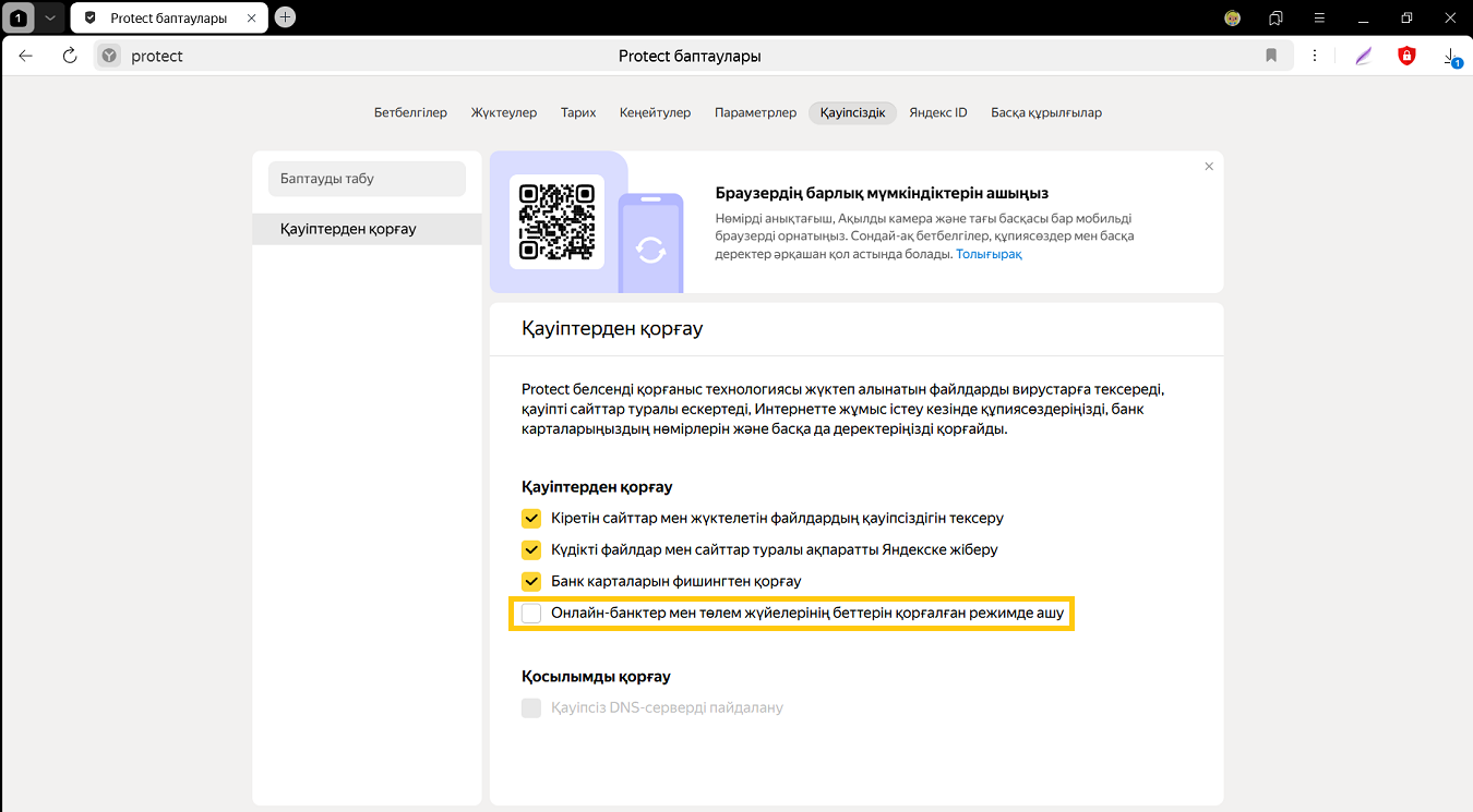 3. Қауіптерден қорғау бөлімінде Онлайн-банктер мен төлем жүйелерінің беттерін қорғалған режимде ашу опциясын өшіріңіз.