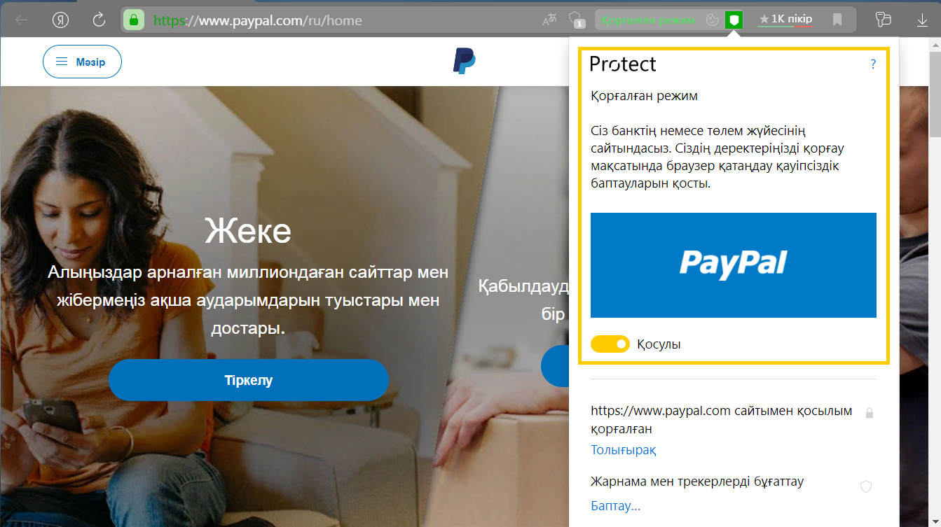 Әдепкі бойынша қорғалған режим банктер мен төлем жүйелерінің сайттарында төлем беттерін ашқанда қосылады. Бұл ретте жоғарғы панель және Браузердің қойындылары қара сұр, ал Ақылды жолда режим атауы мен  белгішесі пайда болады.