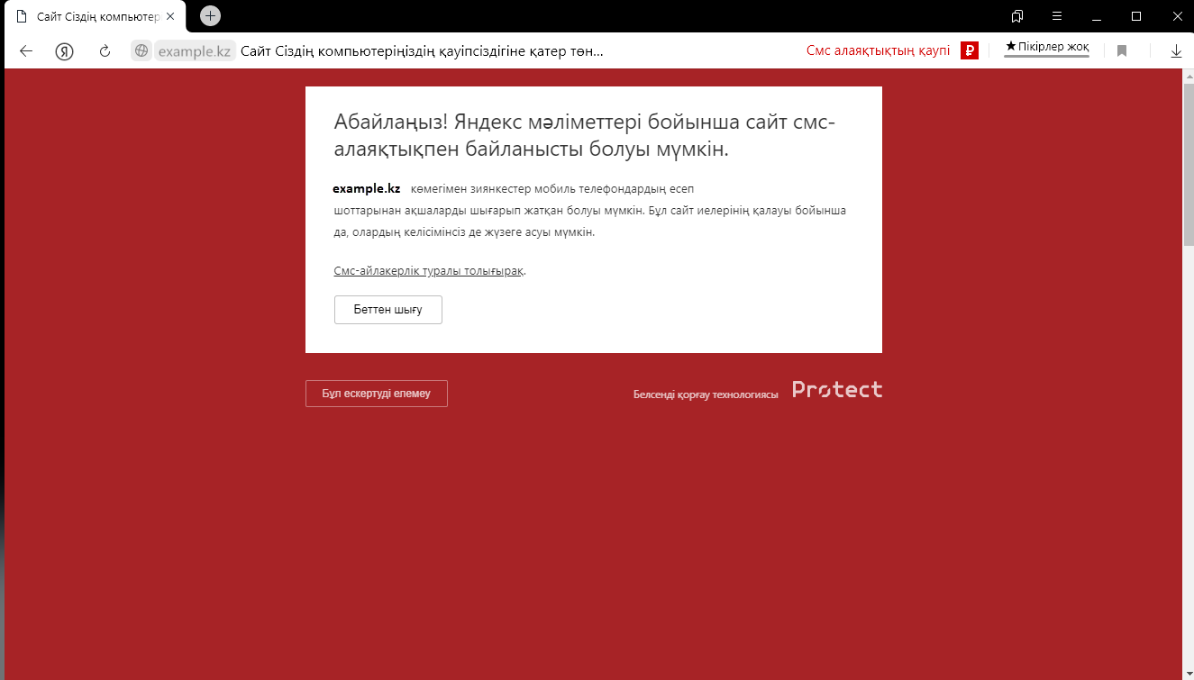 Яндекс алаяқтар пайдалануі мүмкін фишинг сайттары мен ресурстарды қадағалайды. Мұндай сайттардың мекен-жайлары арнайы деректер базасында сақталады. Егер сіз SMS-алаяқтықпен байланысты болуы мүмкін ресурсқа кіруге тырыссаңыз, Браузер ықтимал қауіпті парақшаны бұғаттайды және бұл туралы сізді хабардар етеді — Браузер терезесінде хабарлама және белгішесі Ақылды жолда пайда болады.