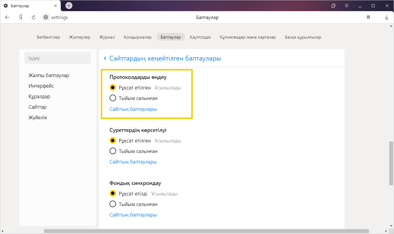 Яндекс Браузер баптауларында электрондық пошта және күнтізбе үшін әдепкі бойынша веб-қызметін орнатуға болады.