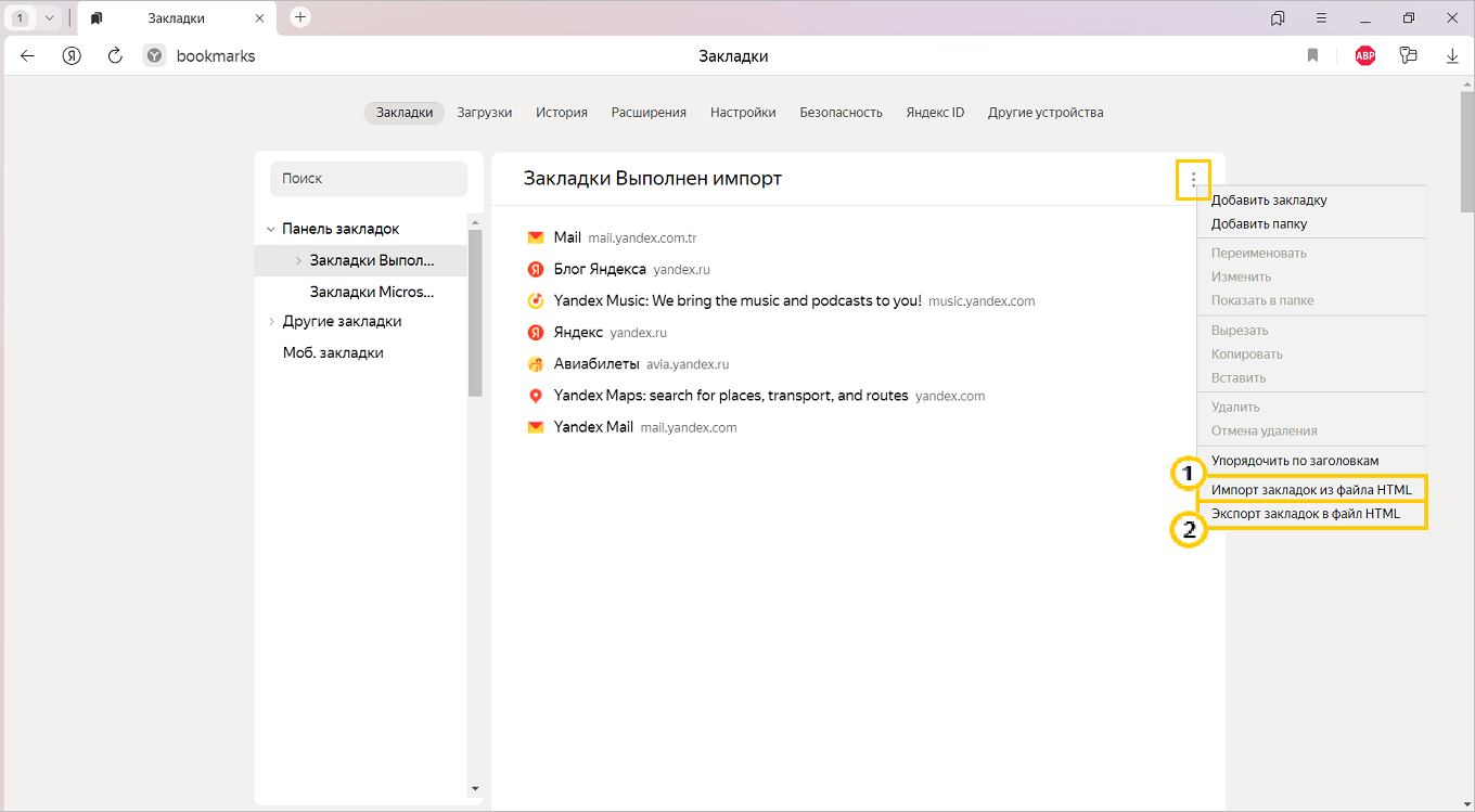2. В строке Панель закладок справа нажмите  → Экспорт закладок в файл HTML.