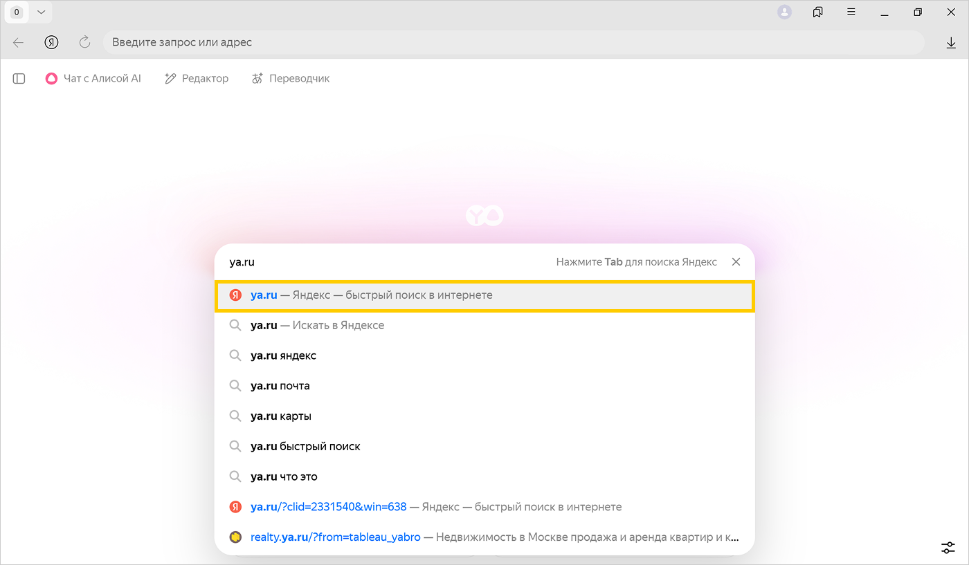 В адресную строку можно вводить поисковые запросы — Браузер сам поймет, что вам нужно.