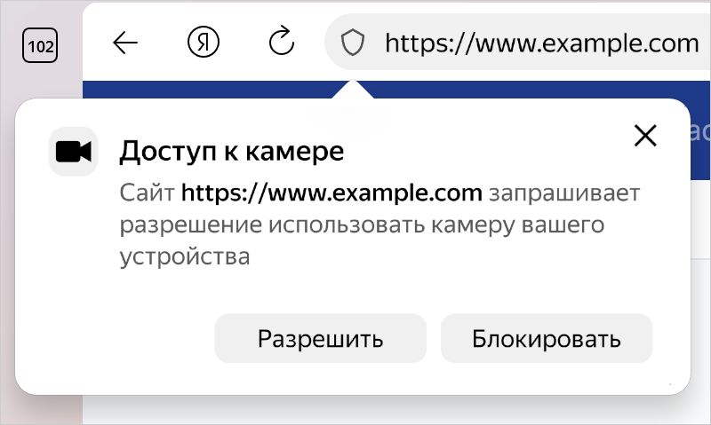 По умолчанию, когда сайт пытается получить доступ к камере, Браузер запрашивает у вас разрешение.