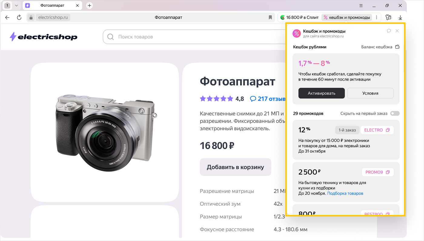Яндекс Браузер помогает экономить при покупках на сайтах интернет-магазинов — получать кешбэк с покупок и находить доступные промокоды.