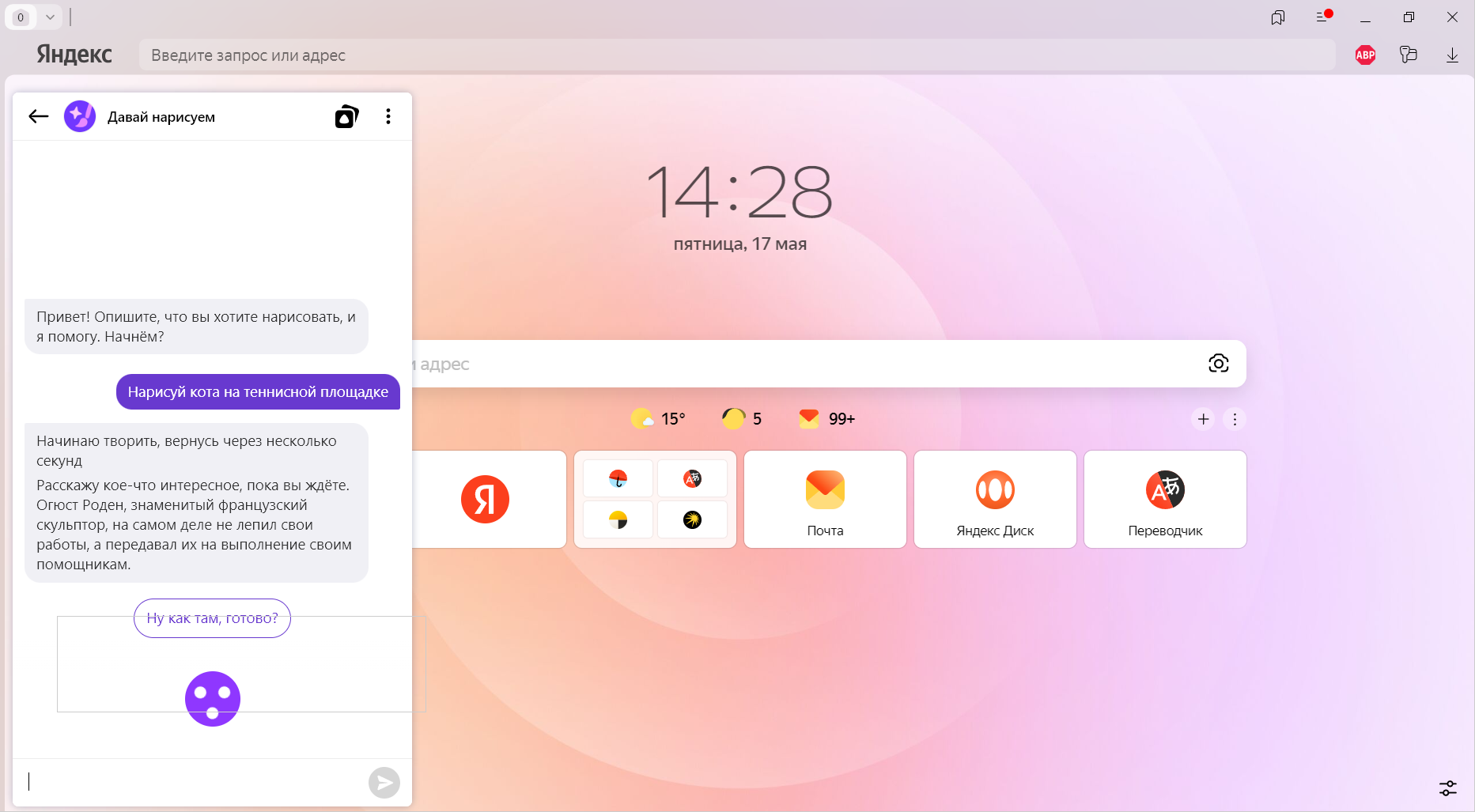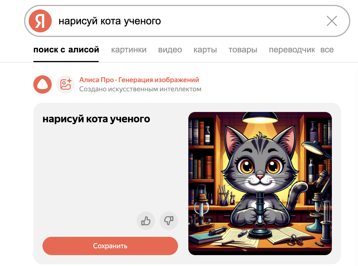 1. В Умной строке опишите, что хотите увидеть на изображении, например «нарисуй кота ученого».