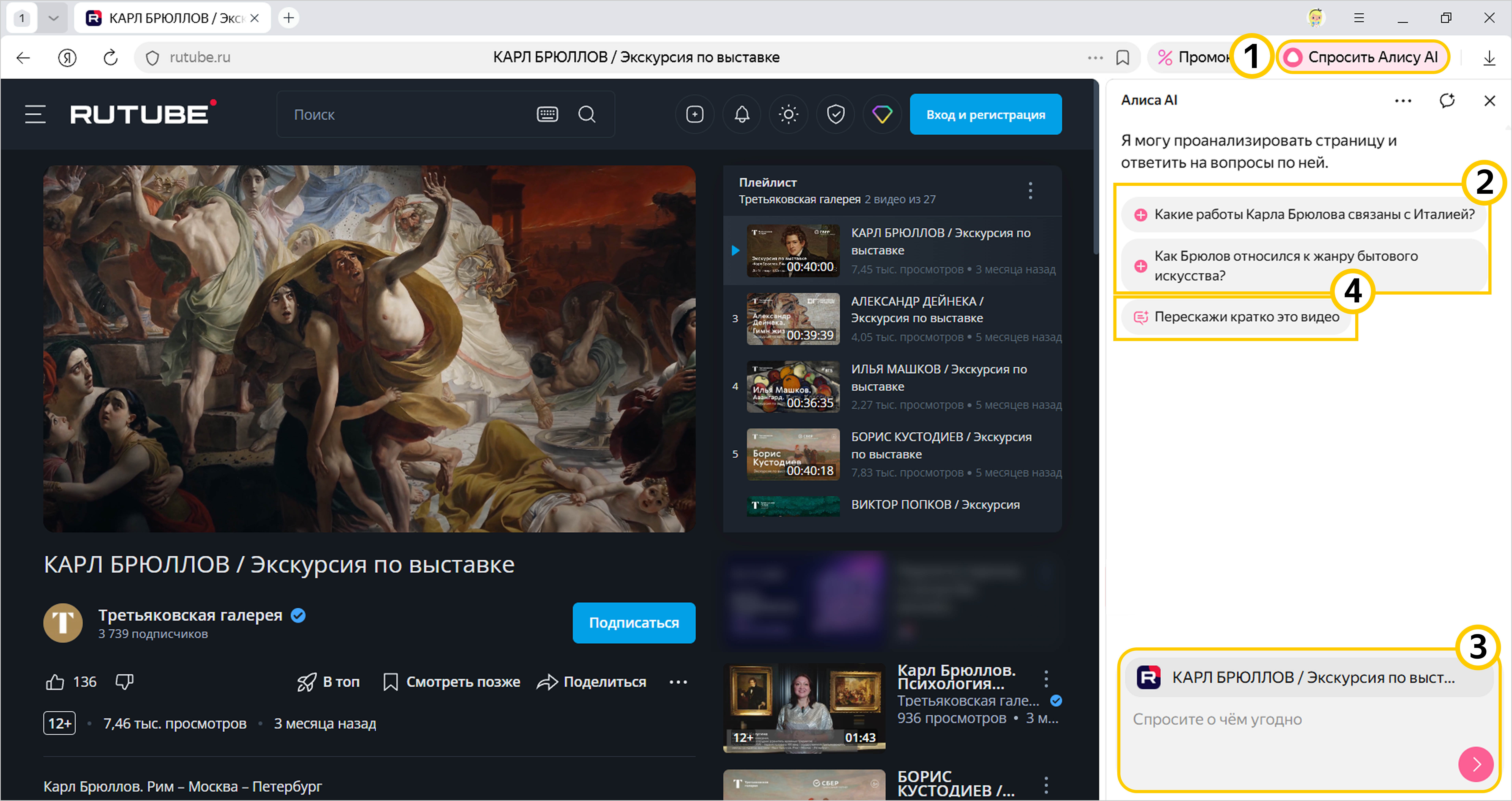 Алиса AI может ответить на вопросы, если на странице только одно видео. Если на странице несколько видео, вы можете задать вопрос к странице.