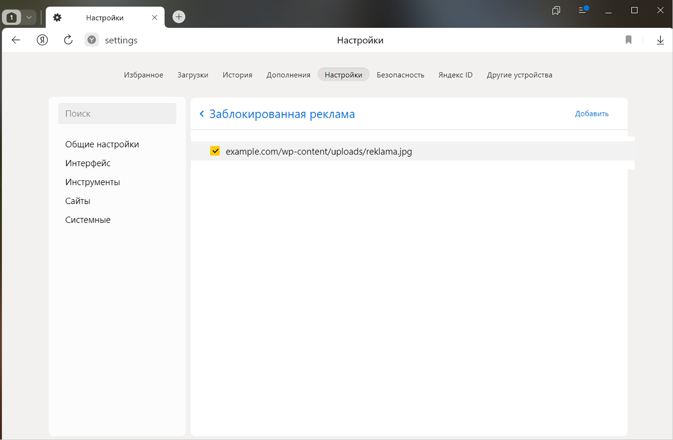 Если Яндекс Браузер не заблокировал мешающий или неприятный рекламный блок, вы можете самостоятельно добавить его в черный список. В этом случае Браузер больше не покажет вам это изображение: