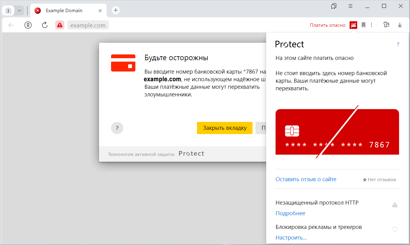 Вы вводите номер карты **** на сайте example.com, не использующем надёжное шифрование. Ваши платёжные данные могут перехватить злоумышленники. |