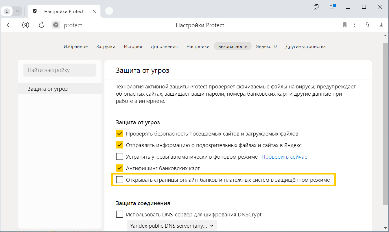 3. В разделе Защита от угроз отключите опцию Открывать страницы онлайн-банков и платёжных систем в защищённом режиме.