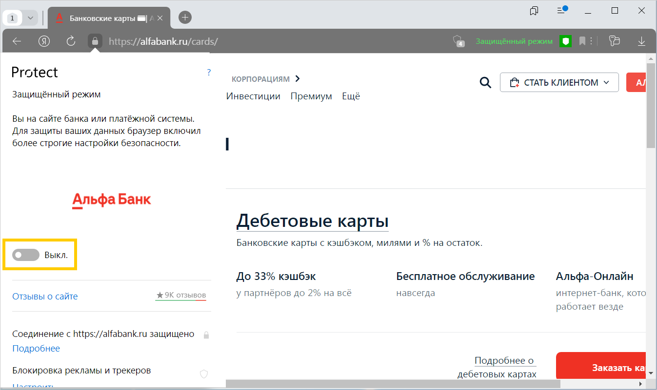 Если защищенный режим не включился, то, скорее всего, возникли проблемы с сертификатом сайта. Лучше не совершать платеж на такой странице. Рекомендуем открыть панель Protect, прочитать информацию об используемом сертификате и оценить риск кражи платежных данных.