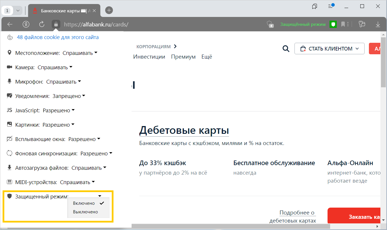 По умолчанию защищенный режим включается при открытии страниц оплаты на сайтах банков и платежных систем. При этом верхняя панель и вкладки Браузера становятся темно-серыми, а в Умной строке появляется название режима и значок .
