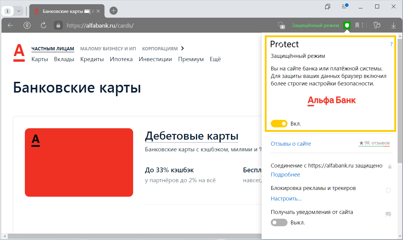 Защищенный режим — это режим, который Яндекс Браузер включает на страницах банков и платежных систем, чтобы сделать электронные платежи более безопасными. В защищенном режиме Браузер включает строгую проверку сертификатов. Если с сертификатом всё в порядке, Браузер отключает расширения и изменяет интерфейс. Защищенный режим является частью комплексной системы защиты Protect.