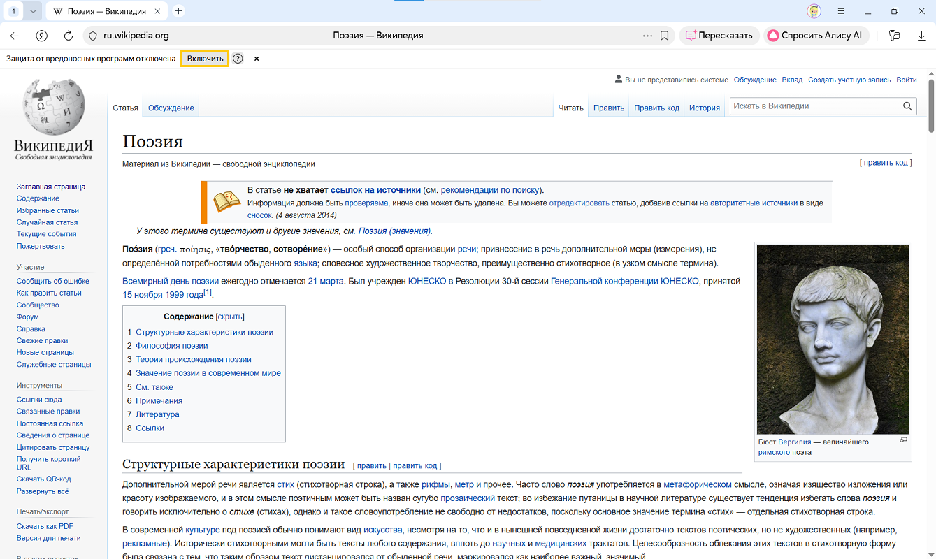 Поэтому, если защита от вредоносного ПО была отключена, Браузер предупреждает об этом и предлагает ее включить: