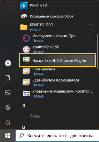 4.1. Откройте Главное меню, прокрутите список программ и нажмите КРИПТО-ПРО → Настройки ЭЦП Browser Plug-in.
