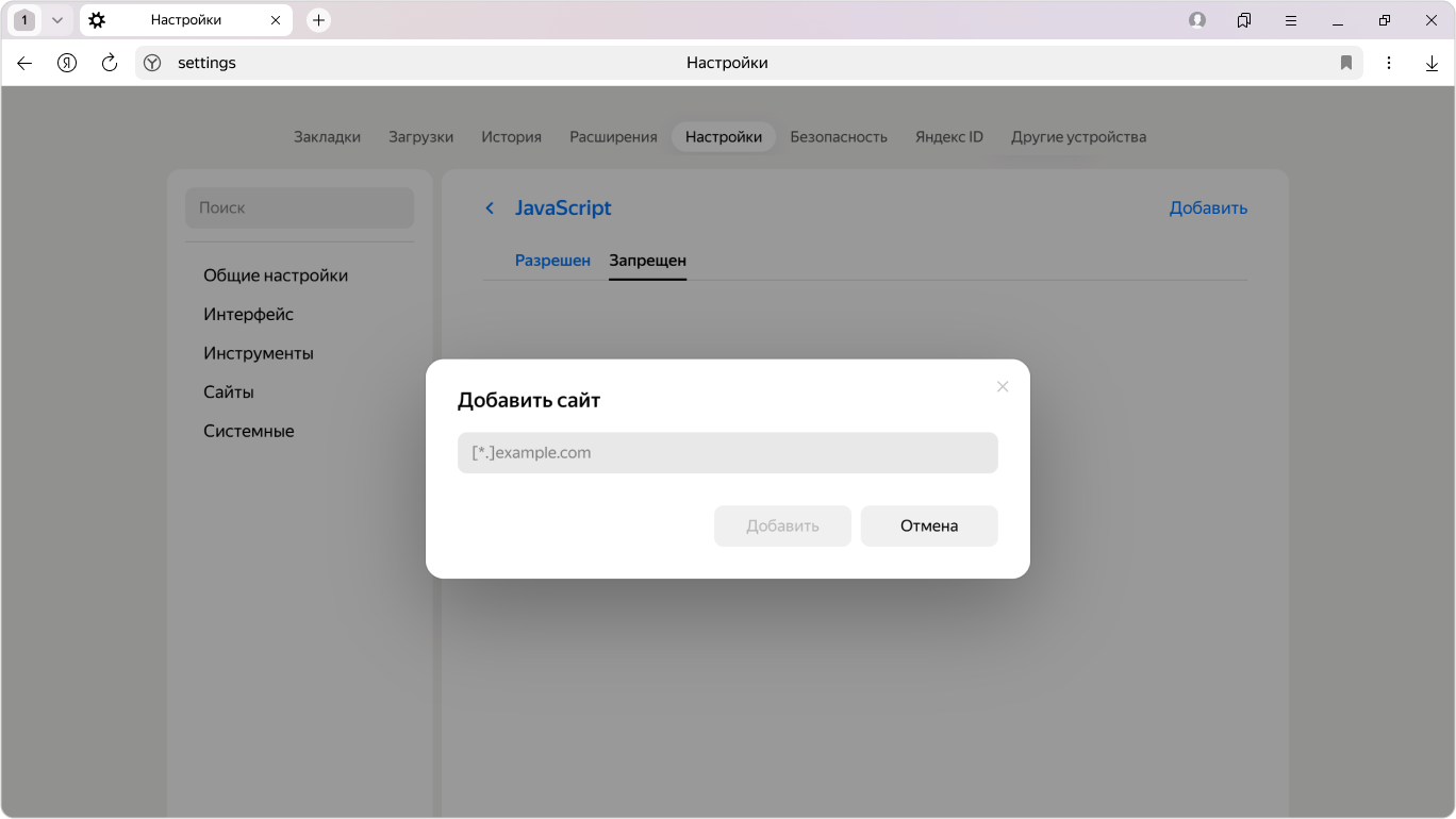 Введите электронный адрес сайта. Для задания адреса можно использовать маски. Например, если вы напишете https://[*.]example.ru, исключение будет действовать для домена и всех его поддоменов.