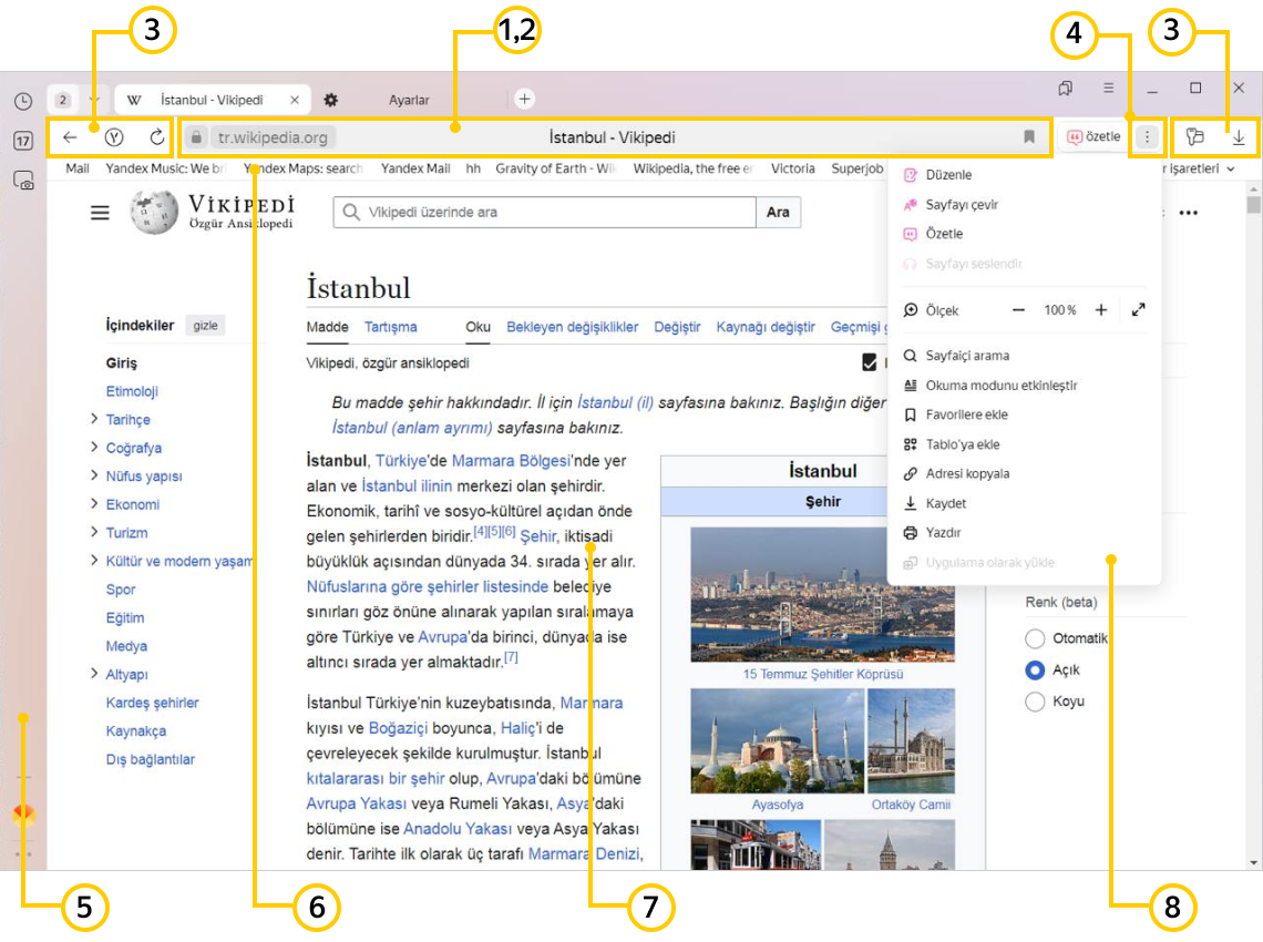 Yandex'e git , İndirilenler, Şifre yöneticisi butonları vb. arasında geçiş yapın.