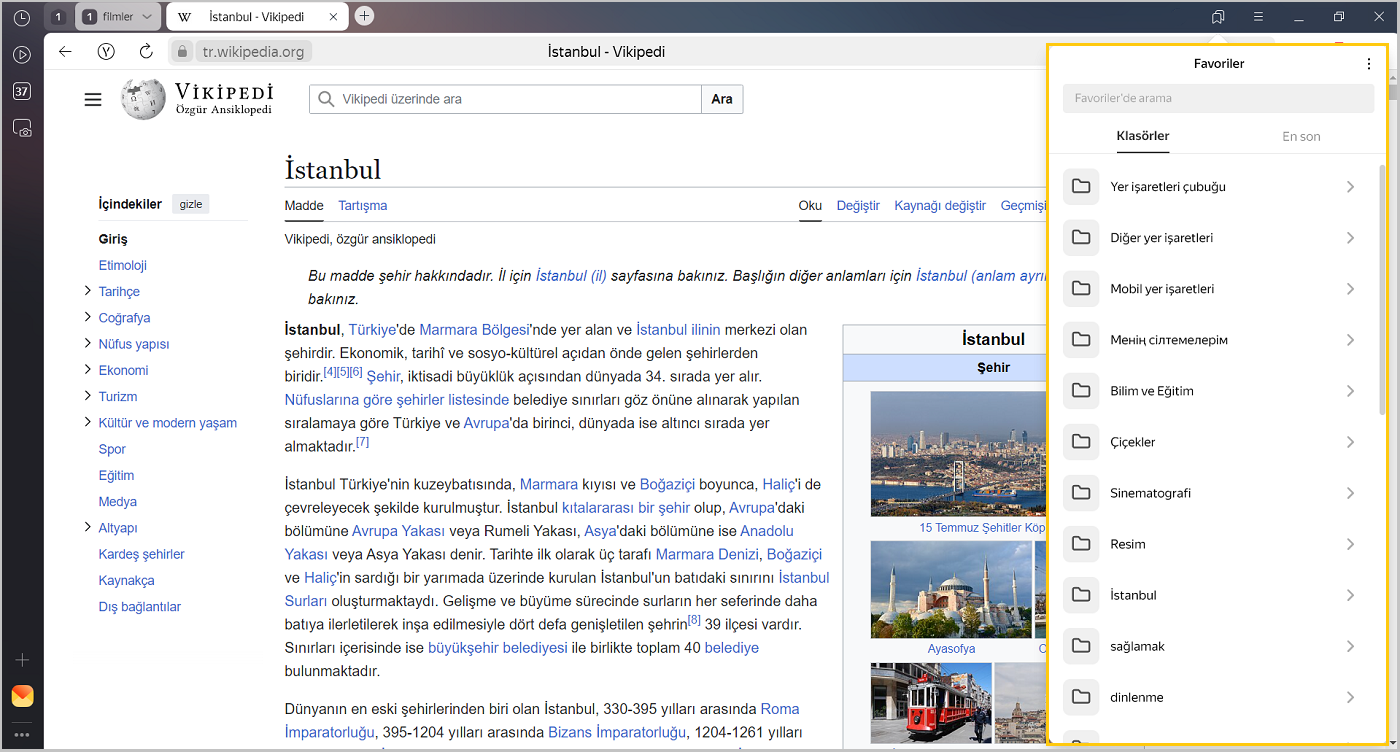 Başka bir tarayıcıdan favorileri içe aktardıysanız aktarılan klasörler de sol menüde görünür. Klasör isimleri aynı kalır. Daha ayrıntılı bilgi için Favorileri içe aktarma bölümüne bakın.