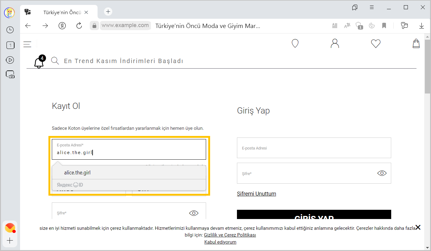 Site formuna ilk kez bilgi girdiğinizde (isim, adres veya telefon numarası), Yandex Browser bunu hatırlar. Tekrar gireceğiniz zaman Yandex Browser otomatik doldurma için seçenekler sunar. Bu size zaman kazandırır.