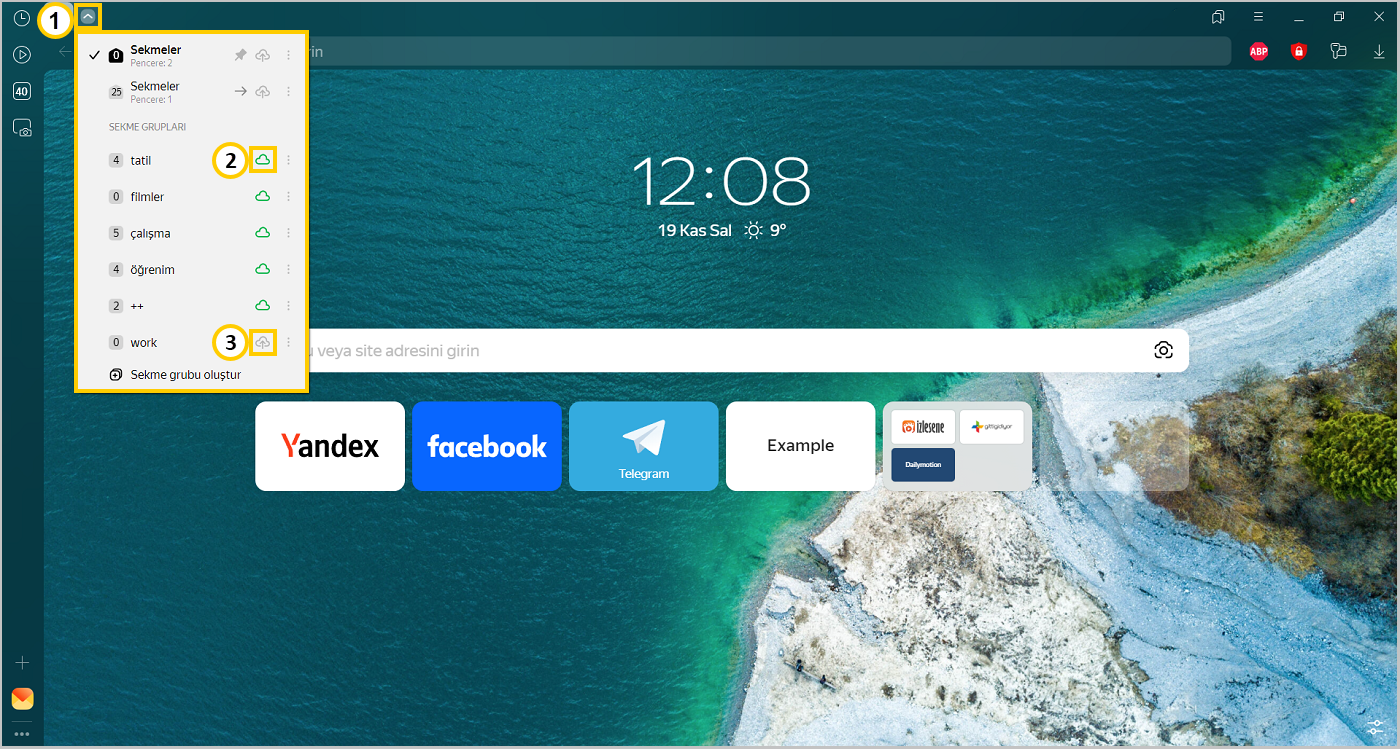 Cihazlarınızı Yandex ID’nizle eşitledikten sonra, bulutta kaydedilmiş olmaları durumunda diğer cihazlarda açık olan grupları ve sekmeleri görüntüleyebilirsiniz. Bu özellik: