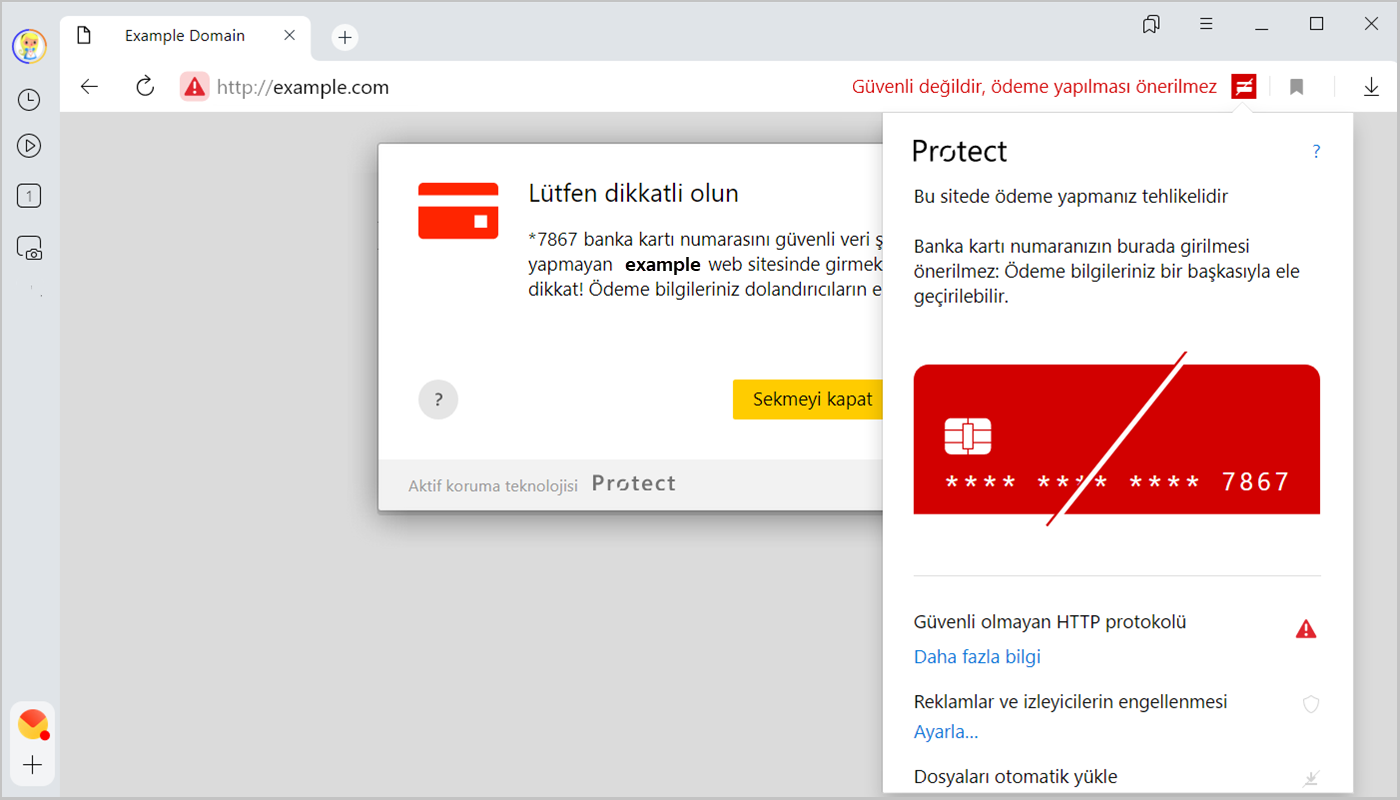 Banka kartı numarasını **** güvenli veri şifrelemesi kullanmayan example.com sitesinde girmek üzeresiniz. Ödeme bilgileriniz internet dolandırıcılarının eline geçebilir.