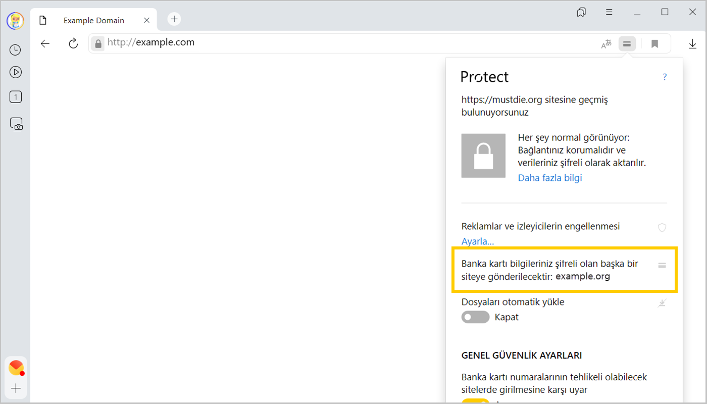Bu siteyle bağlantınız şifreli değil fakat banka kartı bilgileriniz şifreli olan example.com sayfasına gönderilecektir.
