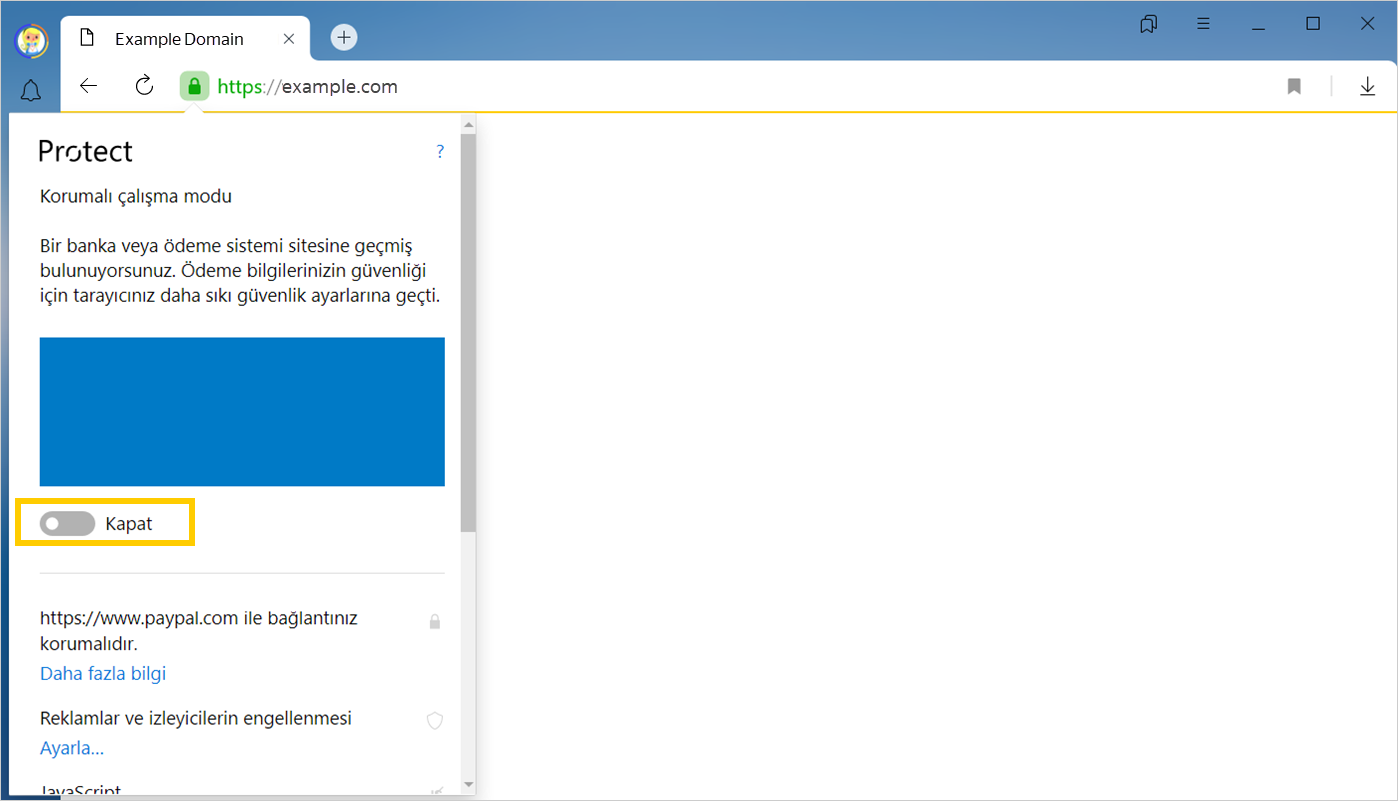 Korumalı çalışma modunun etkin duruma geçmemesi ilgili sitenin güvenlik sertifikasıyla ilgili bir sorun olduğu anlamına gelebilir. Böyle bir sayfada ödeme yapmamanızı öneririz. Bu durumda Protect panelini açmanızı ve kullanılan sertifikanın bilgilerini okuyarak olası riskleri kendiniz değerlendirmenizi öneririz.