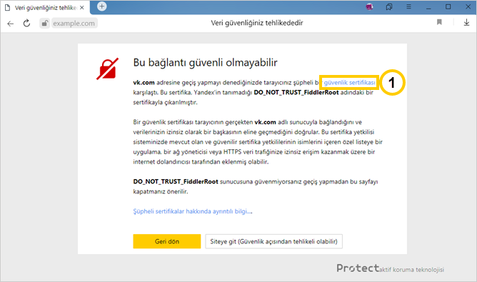 Şu bildirimi görürsünüz: "example.com sitesine geçiş yapmayı denediniz. Bu sitenin güvenlik sertifikası güvenilir değildir. İşletim sisteminiz bu sertifikayı güvenilir olarak kabul ediyor ancak bu sertifikayı sağlayan sertifikasyon kuruluşu Yandex tarafından bilinmemektedir...".