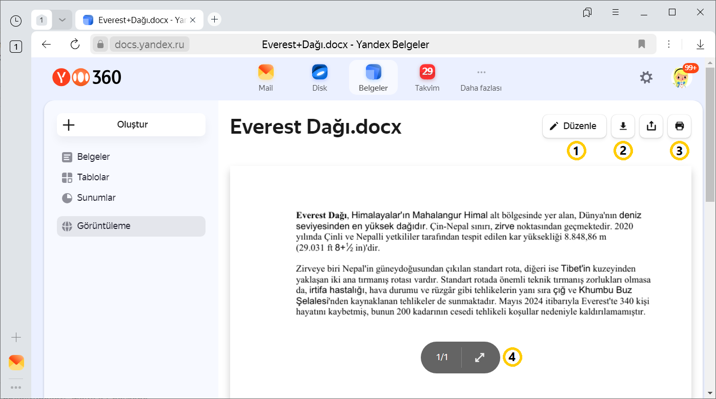 Yandex Browser’da açılan belgeler, tablolar ve sunumlar Yandex Belgeler yardımı ile düzenlenebilir. Bunu yapmak için belgenin üst kısmındaki Kopyayı düzenle butonuna tıklayın. Belgenin bir kopyası Yandex Disk'te İndirilenler klasörüne kaydedilir. Ayrıca belgeleri, arkadaşlarınızla veya aynı iş yerinde bulunduğunuz kişilerle çevrimiçi düzenleyebilirsiniz. Daha fazla bilgi için Yandex Belgeler Yardım bölümüne göz atın.