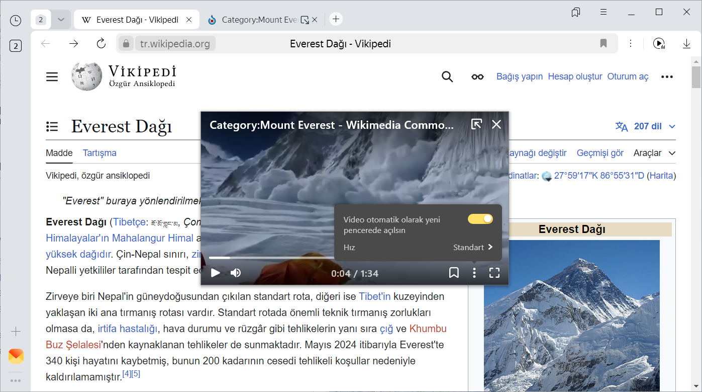 Videoyu kendiniz başlattıysanız veya video sesli bir şekilde oynatılıyorsa, ayrı bir pencerede açılır. Gizli Mod'da video ayrı bir pencerede oynatılamaz.