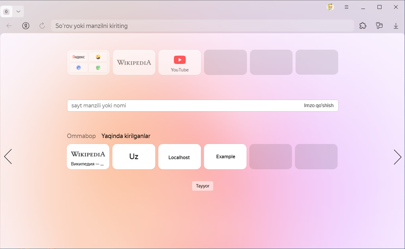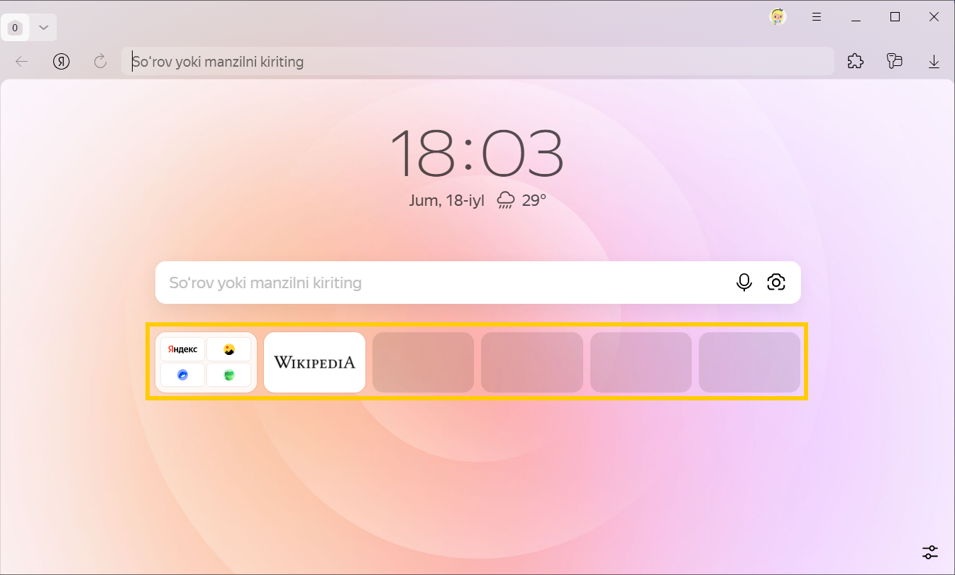 Manzil satriga qidirish soʻrovlarini kiritish mumkin — Brauzer sizga nima kerak ekanini oʻzi tushunadi.