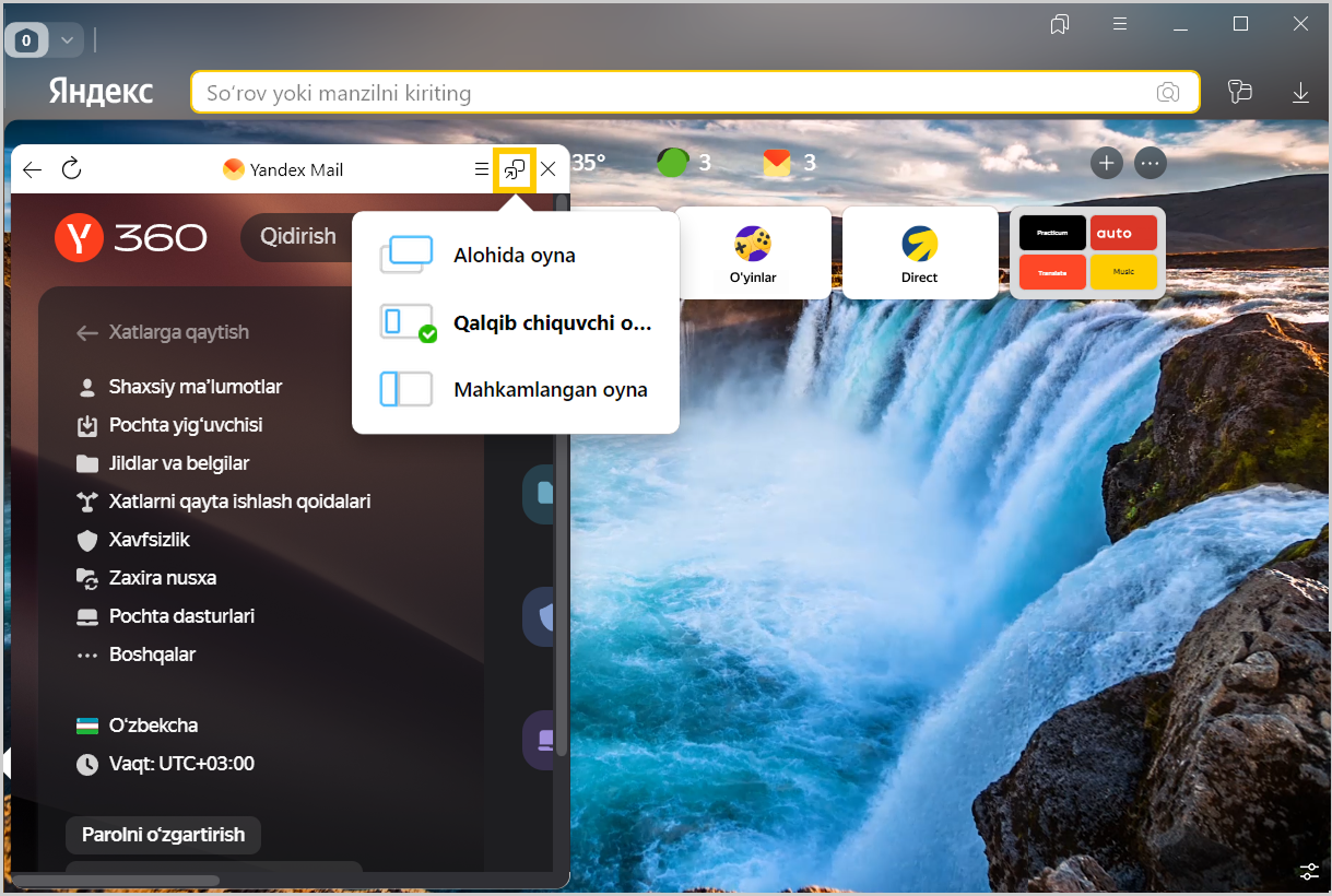 Bu rejimda siz asosiy oyna bilan ishlayotganda yana bitta xizmatni koʻrishingiz mumkin (chatlar, pochta, onlayn translatsiya).
