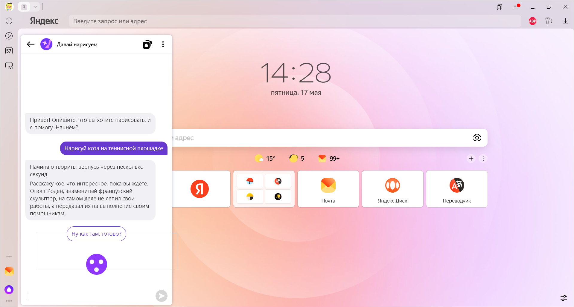 YandexART neyrotarmogʻi bevosita Brauzerda, masalan, ijtimoiy tarmoqlardagi post yoki taqdimot uchun rasm yaratishga yordam beradi. Rasm yaratish uchun: