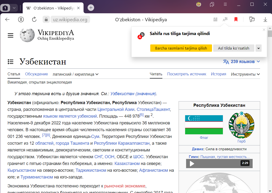 Brauzer sahifadagi alohida so‘z yoki jumlalarni rus tiliga tarjima qilish mumkin. Soʻz yoki iboraning tarjimasini koʻrish uchun ularni belgilang va kontekst menyusida Tarjima tugmasini bosing. Sahifada tarjima oynasi paydo boʻladi.