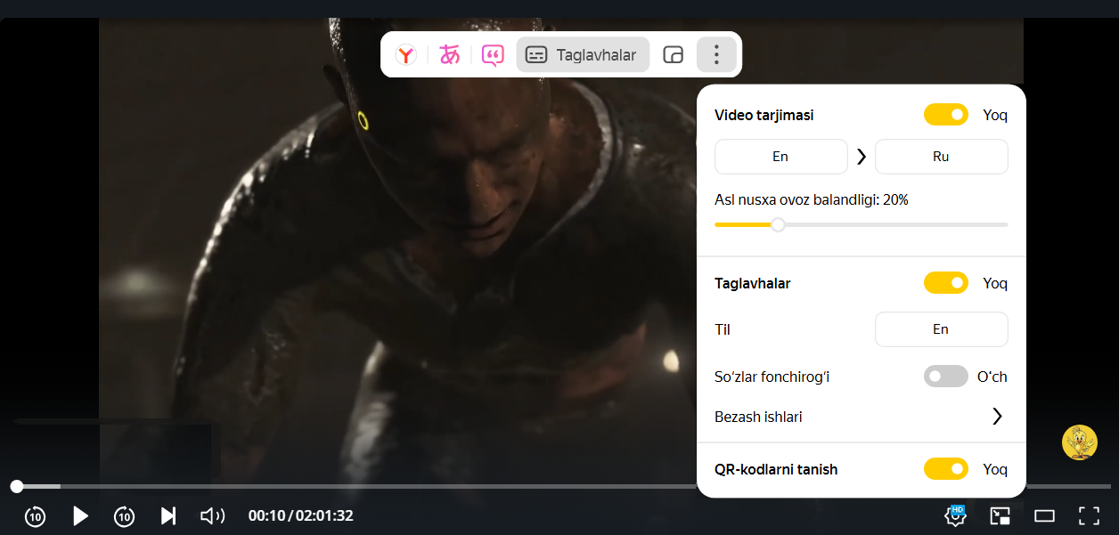 Til — asl yoki tarjima tilini tanlashingiz mumkin. Agar videoda allaqachon subtitrlar boʻlgan boʻlsa, Yandex emas, balki xizmatning subtitrlarini koʻrsatish mumkin.