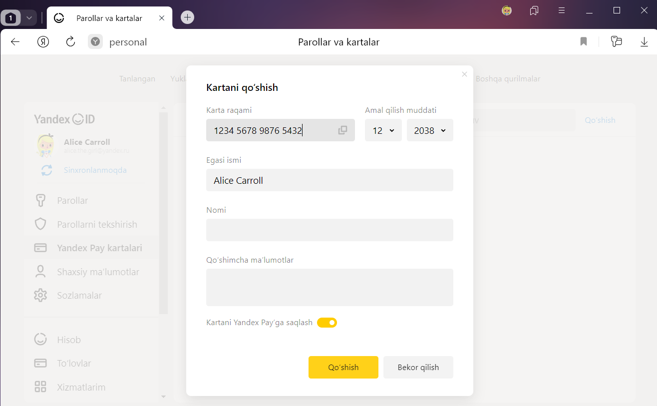 Xavfsizlik sababli karta ma’lumotlari siz asosiy paroldan foydalanayotgan bo‘lsangiz, sinxronlanadi. Sinxronlash jarayonida karta ma’lumotlari ishonchli himoyalanadi.
