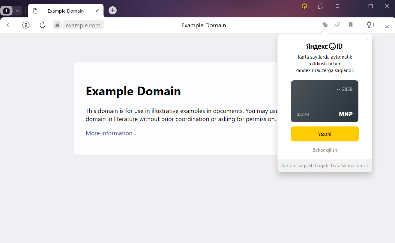 Brauzerga bank kartasi ma’lumotlarini birinchi marta kiritganingizda u keyinchalik saytlarda to‘lov shakllariga qo‘yish uchun ularni saqlashni taklif qiladi.