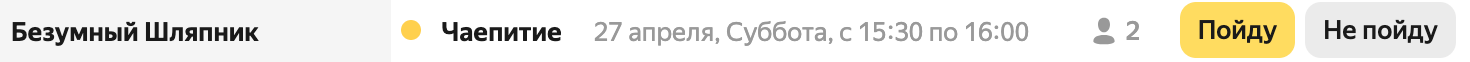 Чтобы принять приглашение, нажмите на событие левой кнопкой мыши в сетке календаря, а затем кнопку Пойду.