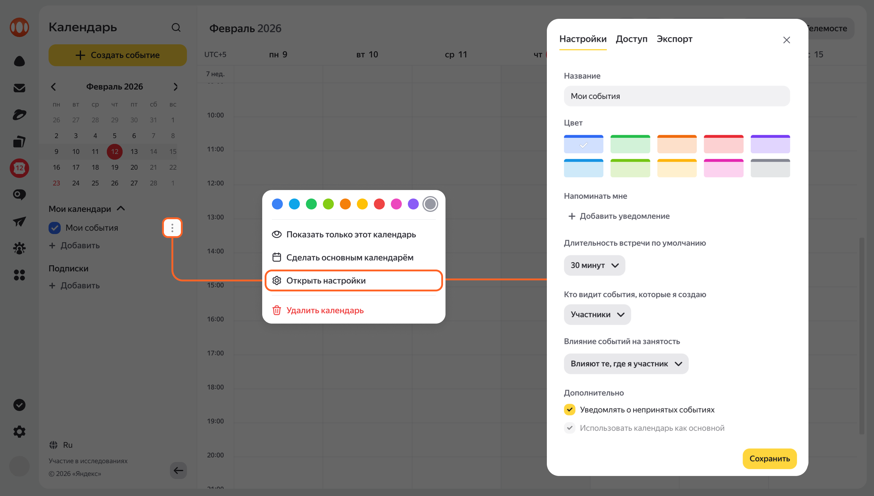 Чтобы открыть настройки конкретного календаря, наведите курсор на его название на панели слева и нажмите