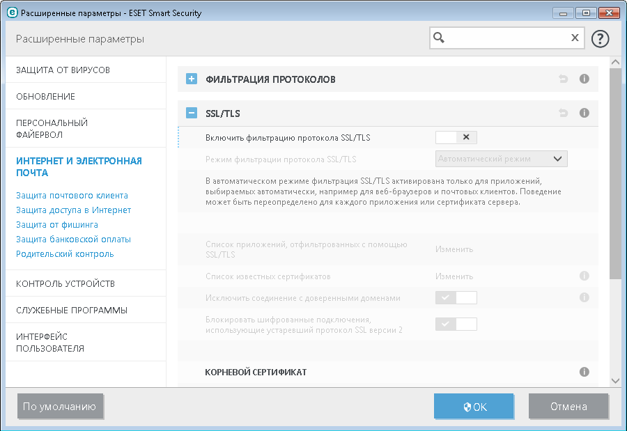 В блоке Интернет и электронная почта → SSL/TLS отключите опцию Включить фильтрацию протокола SSL/TLS.