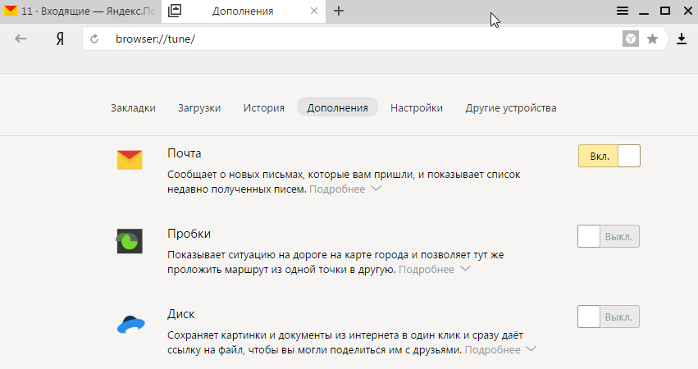 В разделе Сервисы Яндекса включите дополнение Почта.