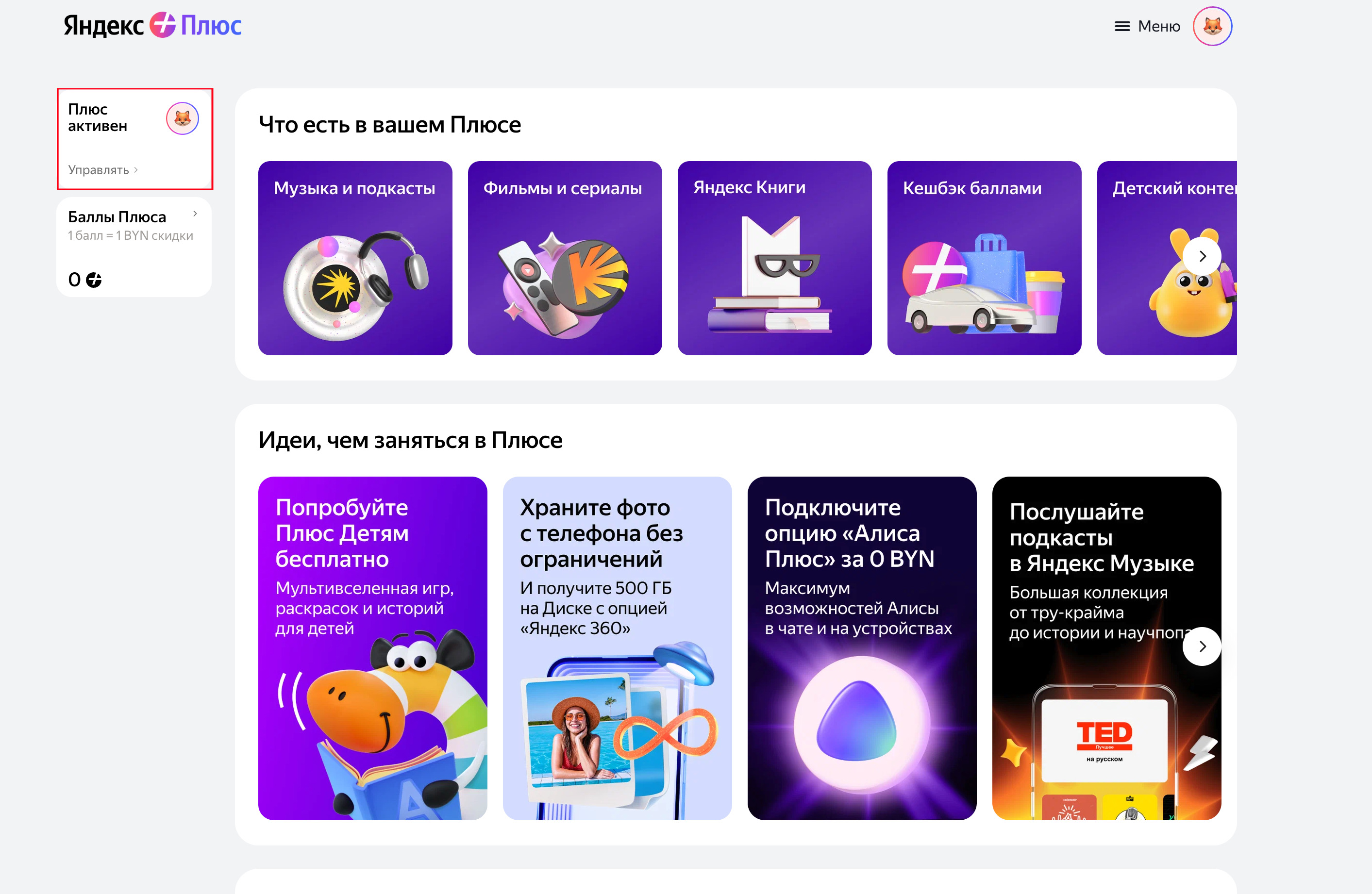 Управлять подпиской Яндекс Плюс можно в личном кабинете, например: