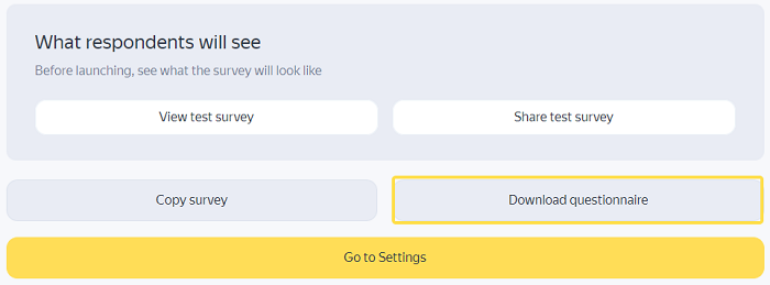 If there is a whole team working on a survey, unloading the questionnaire to a separate document in the Word format allows you to share it with your colleagues or customers who don't have access to the Yandex Surveys account. It helps you get comments or remarks from them. Also you can save the finished file to your computer and use it in future projects.