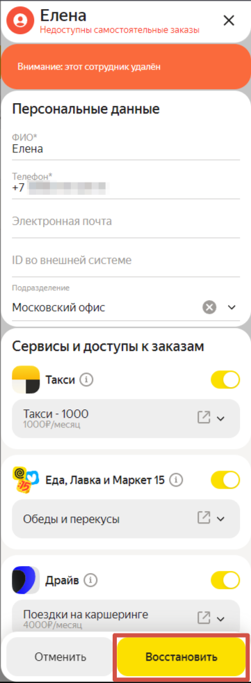 После этого откроется боковое меню с карточкой сотрудника — нажмите ещё раз Восстановить.