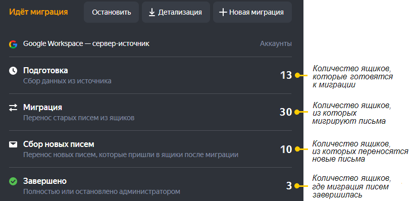 Во время миграции напротив соответствующего этапа будет отображаться 0. Если на этапе Миграция вы видите 0 — значит, перенос старых писем из ящиков завершен. Если вы хотите перенести только старые письма и не собирать новые, на этом этапе можно завершить миграцию вручную кнопкой Остановить.