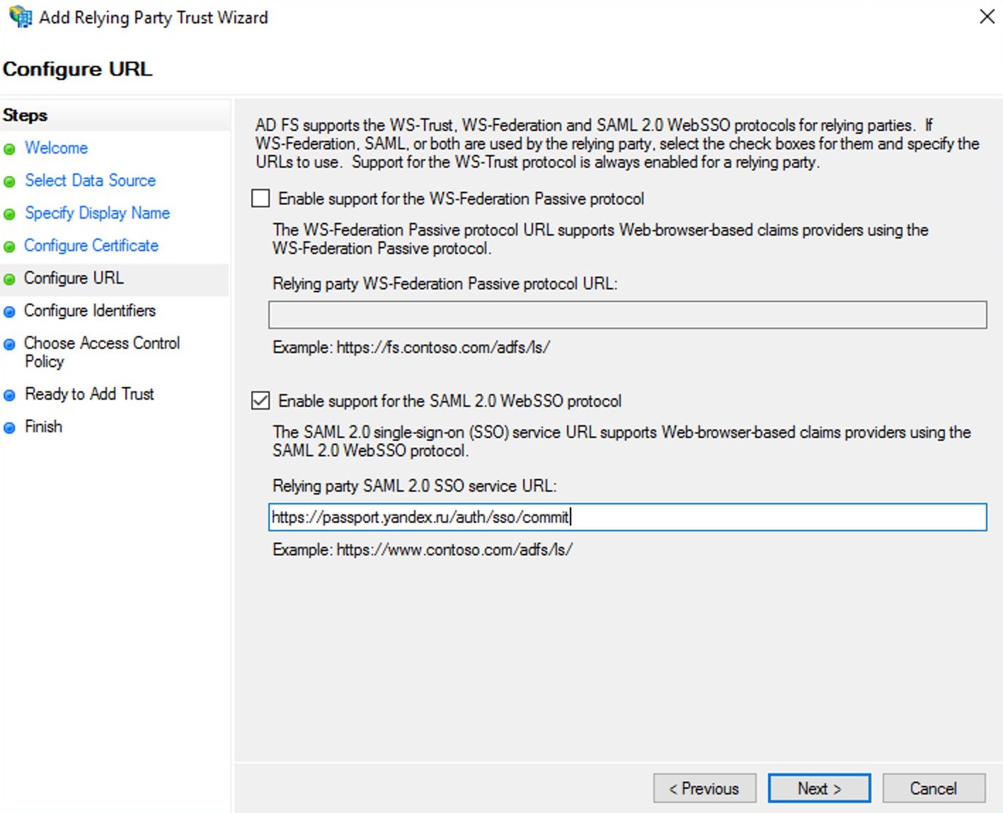 Отметьте Enable support for the SAML 2.0 WebSSO protocol и укажите Service URL: