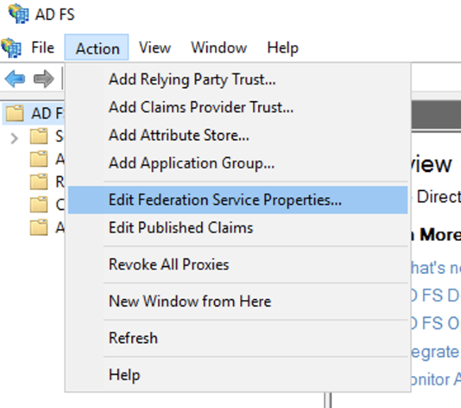 http://домен/adfs/services/trust.Чтобы получить его, в консоли управления перейдите на вкладку Action и выберите Edit Federation Service Properties.