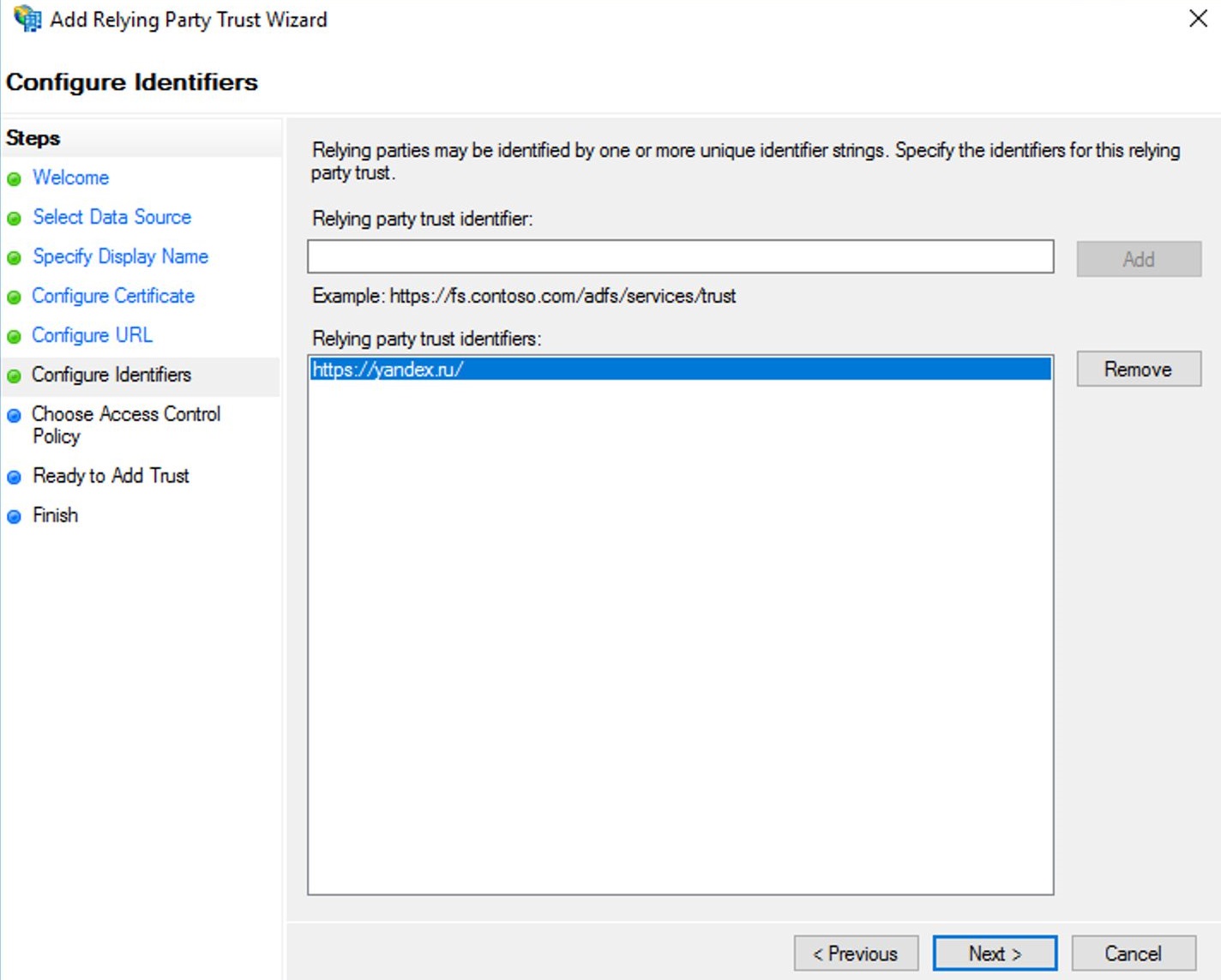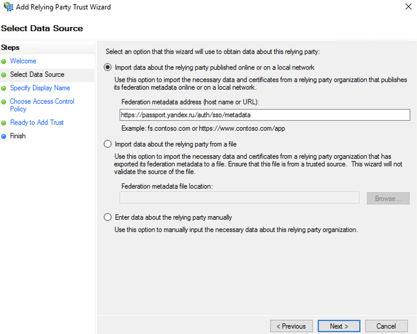 Для автоматической настройки отношения на шаге Select Data Source выберите Import data about the relying party published online or on a local network и введите URL: