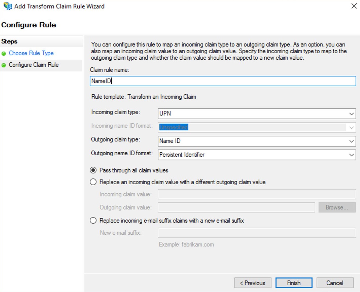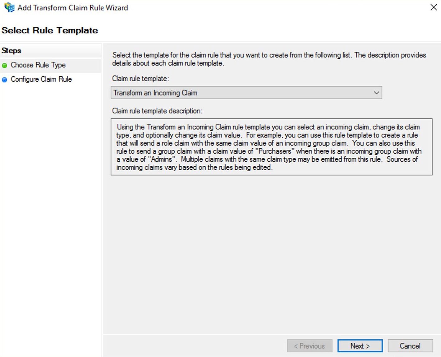В качестве Claim rule template выберите Transform an Incoming Claim и нажмите Next.
