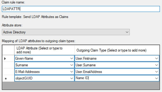 Задайте правилу название, например «LDAPATTR». Заполните остальные поля, как указано ниже. Напротив типа «Name ID» укажите атрибут: «objectGUID», «objectSID» или другой.
